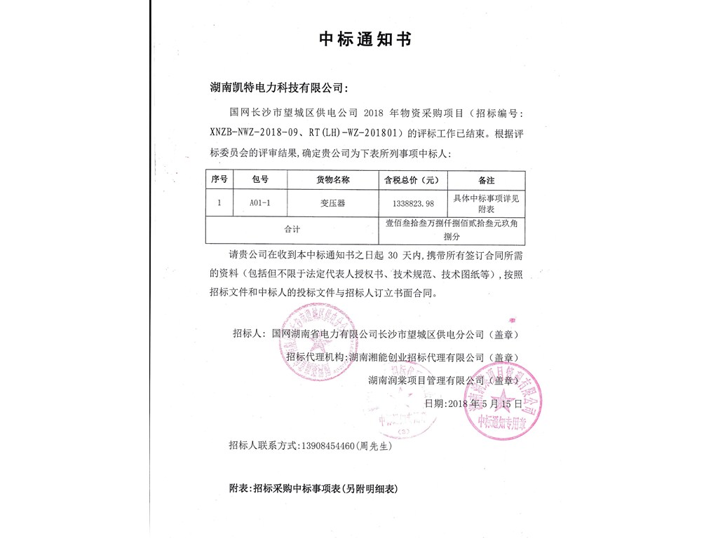 望城中标通知书 湖南凯特电力科技有限公司主要生产...